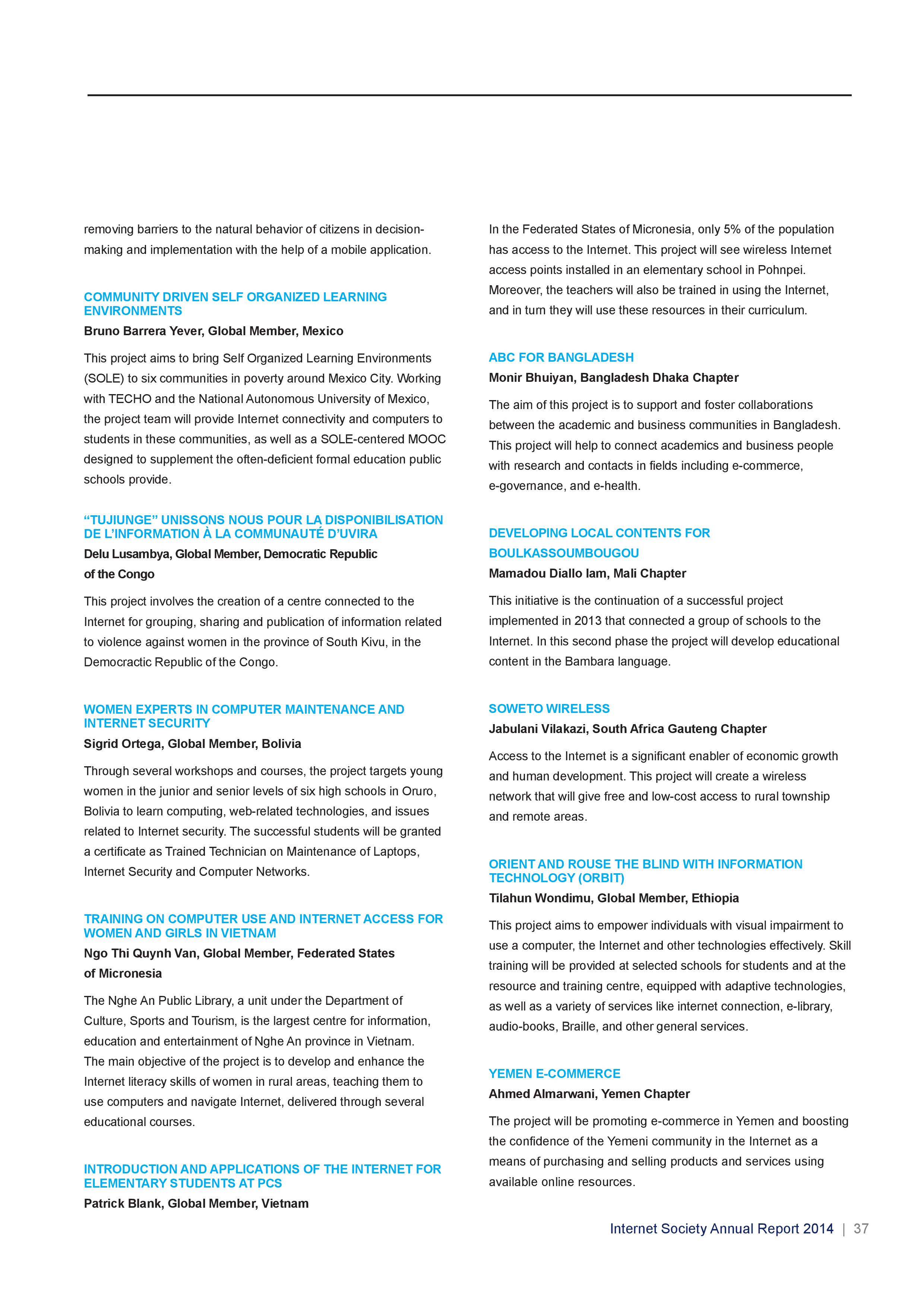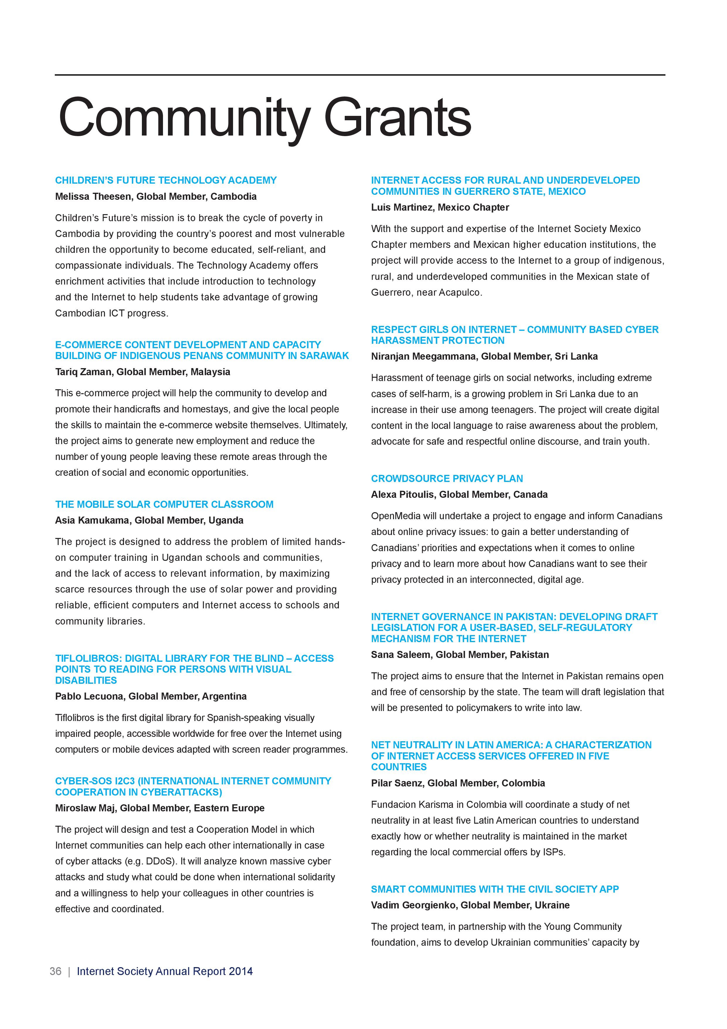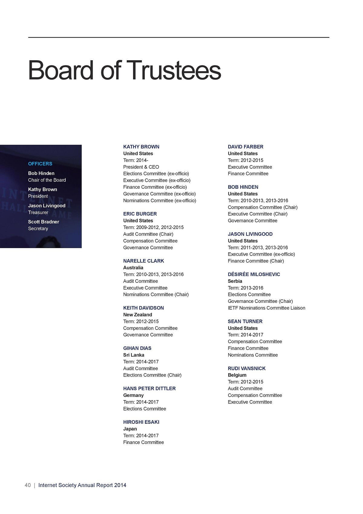Trustees serve in the interest of the Internet Society as a whole, but are appointed or elected by the following groups: Chapters, Organization members, and the Internet Engineering Task Force (IETF).