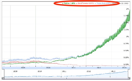 So in just slightly less than a year, the amount of IPv6 traffic has doubled … and after so many years with so little growth the trend line now is moving in the right direction!