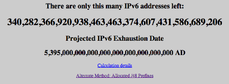 In the spirit of the IPv4 Exhaustion Counter, we were greatly amused to see that there is an IPv6 Exhaustion Counter. 🙂