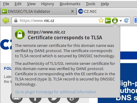 P.S. Do note that in order for this to work in your web browser needs to have access to a DNSSEC-validating DNS resolver. [UPDATE: As noted in the comments to this post, the add-on no longer requires access to a DNSSEC-validating DNS resolver. The required capabilities were built into the code instead. Having said that, it’s still also great to make sure your local DNS resolver does do DNSSEC validation for all the other apps you have.] The add-on can use DNSSEC-validating DNS resolvers from CZ.NIC or Google, buy why not make your network that much more secure and install your own DNSSEC-validating resolvers? Check out our recent weekend project to learn more about how to configure DNSSEC validation on your local DNS resolver.