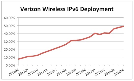 The latest World IPv6 Launch measurements of network operators were published yesterday and among the charts available for the top 10 networks was this great one showing Verizon Wireless’ network as almost hitting 50% IPv6 deployment: