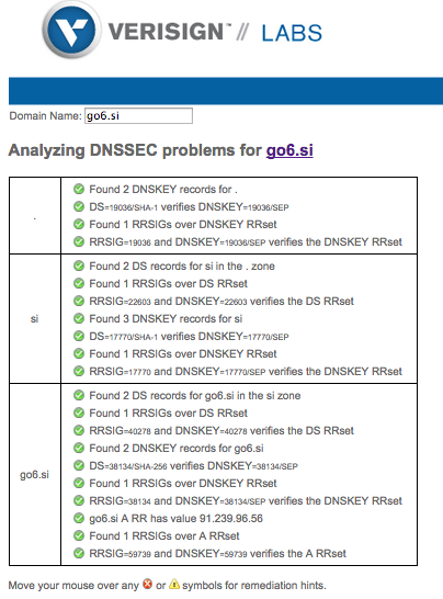 At first glance all worked fine, following the deployment guide we added go6.si, go6lab.si and zorz.si zones for signing (zorz.si was a test “mule” to see if the process works). The signer got the zones, signed them and pushed them to both name servers nsec1.go6lab.si and nsec2.go6lab.si. Our .si TLD dnsmaster Benjamin Zwittnig inserted for us DS records in .si zone and the whole thing started to work. We are pressing now our registrar to implement the tool to insert DS records to .si zone without bothering Benjamin. Hopefully this happens soon.