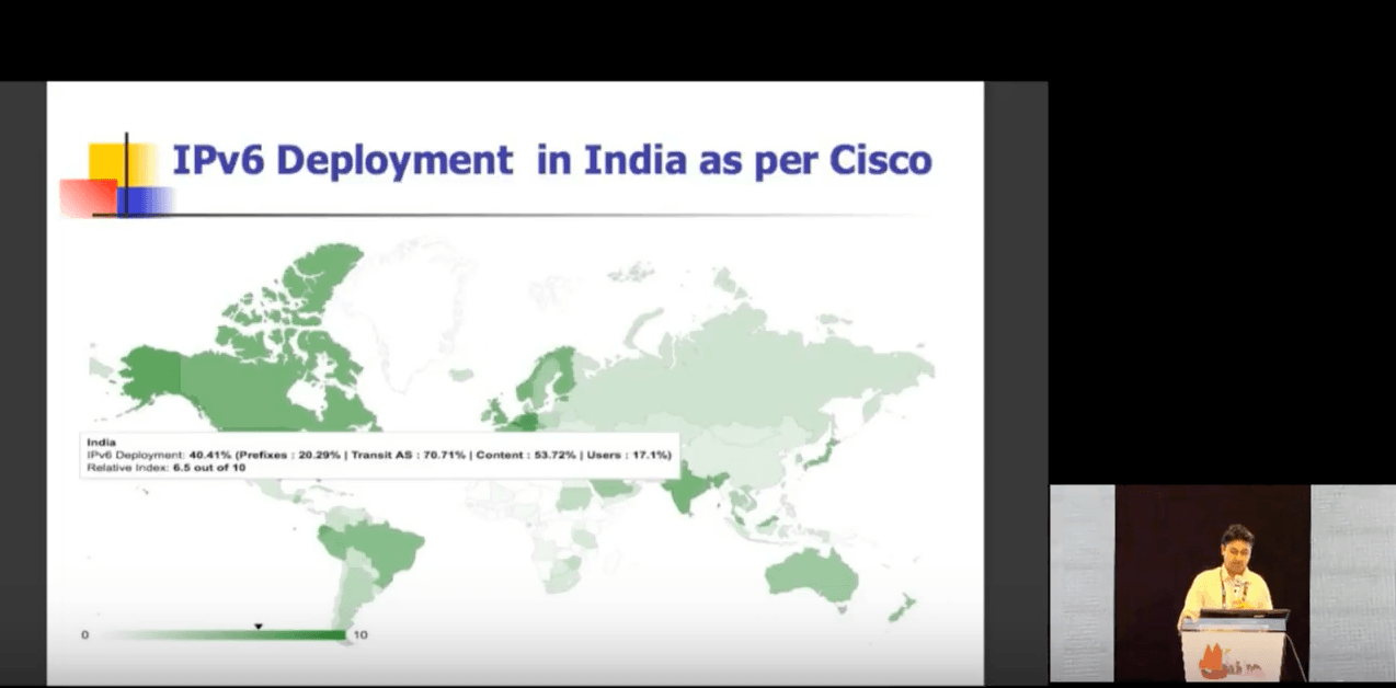 The IPv6 situation in India as presented by Ajai Kumar (NIXI) is becoming interesting, with different measurements calculating IPv6 deployment somewhere between 20 and 40% which makes India the economy with the highest rate of deployment in the Asia-Pacific region. Even more encouragingly, some large organisations including the State Bank of India have even higher rates of deployment, most of the major IXPs are IPv6-enabled, whilst the .in ccTLD also support IPv6.