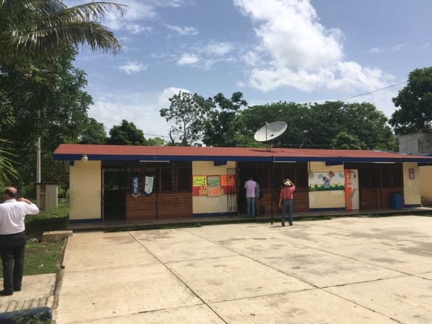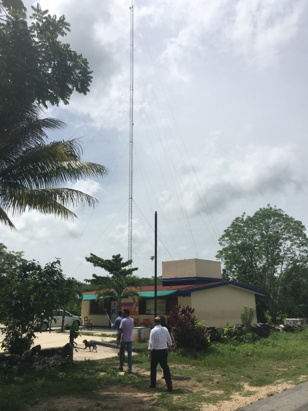 Hubo buenas noticias en ese tema, también. Parece ser que otro grupo de personas, en un proyecto previo para llevar internet algunos años antes, había dejado instalada una torre de radio en la escuela. Nuestro equipo de Kaanbal e ISOC Mexico registraron la información necesaria acera de la ubicación de esta torre, así como su altura.