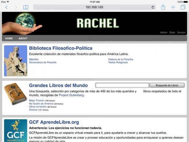 La verdad era que nosotros llevamos “recursos de internet” a la comunidad. El contenido de Wikipedia, un paquete de cursos de Khan Academy, libros, guías médicas y de salud, videos de cómo tocar instrumentos, y mucho más. RACHEL (acrónimo de Remote Area Community Hotspot for Education and Learning) es un Proyecto de World Possible para llevar educación y contenidos a comunidades aisladas como Agua Azul.
