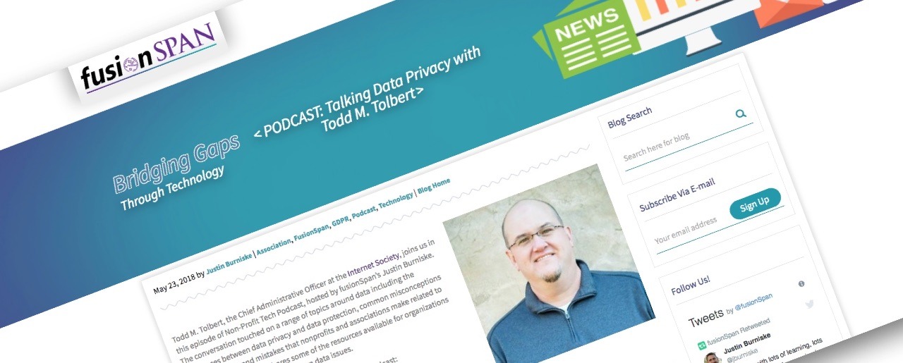 « Mettons la barre plus haut sur la confidentialité des données et rendons Internet plus sûr. » Avec l’arrivée imminente du Règlement général sur la protection des données de l’UE (GDPR), ce fut l’un des points soulevés par Todd M. Tolbert, notre directeur administratif, dans un épisode du podcast « Tech à but non lucratif » qui fut publié hier. Hébergé par Justin Burniske de fusionSpan, l’épisode de 35 minutes couvrait un large éventail de sujets, notamment: