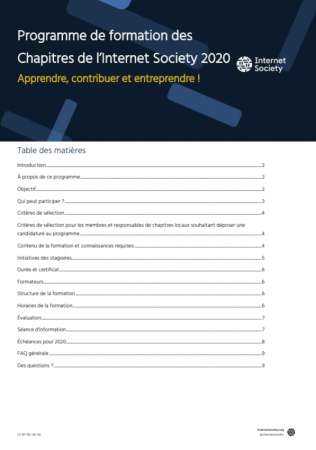 Les membres ajoutent énormément de valeur, d’expériences et de connaissances au sein de notre organisation. C’est pourquoi nous sommes ravis d’annoncer le Programme de formation des chapitres 2020 de l’Internet Society. Il s’agira de notre premier programme de formation et d’engagement destiné aux membres des chapitres axé sur le développement de nouveaux leaders de la communauté, capables de travailler avec leurs chapitres respectifs, de susciter localement une sensibilisation aux travaux effectués dans le cadre de notre Plan d’action 2020 et d’étudier les moyens d’impliquer les membres.