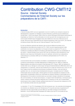 L’Internet Society contribue au processus préparatoire de la CMTI ITU avec l’espoir que les résultats de la CMTI permettront la croissance et l’innovation continuelles qui sont le futur des communications mondiales. Dans cette contribution, l’Internet Society offre ses perspectives sur certaines propositions se trouvant dans CWG-CMTI12/TD-43.