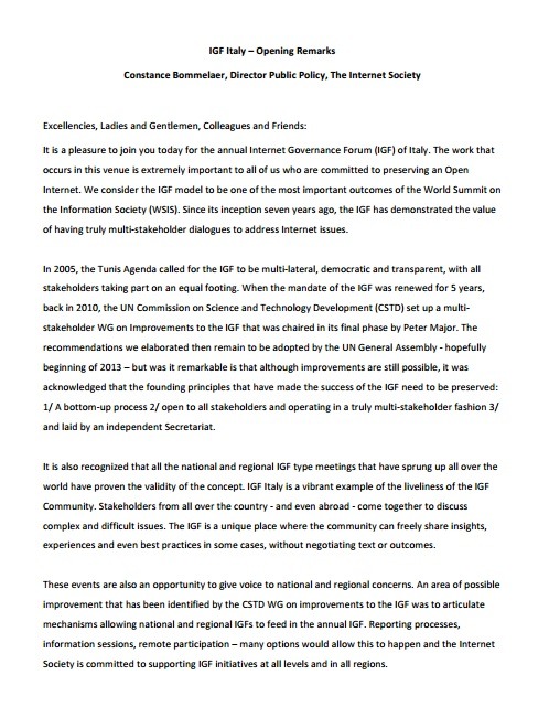 It is a pleasure to join you today for the annual Internet Governance Forum (IGF) of Italy. The work that occurs in this venue is extremely important to all of us who are committed to preserving an Open Internet. We consider the IGF model to be one of the most important outcomes of the World Summit on the Information Society (WSIS). Since its inception seven years ago, the IGF has demonstrated the value of having truly multi-stakeholder dialogues to address Internet issues.