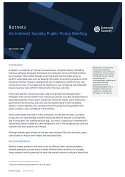 The Internet Society believes that a collaborative approach among all relevant stakeholders will provide the best botnet-mitigation solutions and security protection. This approach is embodied in the Internet Society’s Collaborative Security principles, which emphasize a shared and collective responsibility to achieve desired outcomes. [4] This collaborative security approach comprises the following principles: