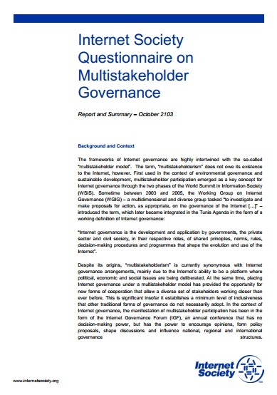 Internet Society Questionnaire on Multistakeholder Governance Report and Summary of the Results. October 2013 Thumbnail