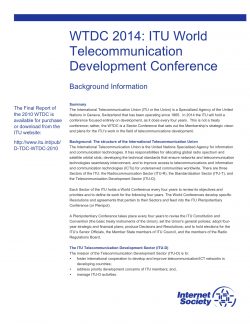 The International Telecommunication Union (ITU or the Union) is a Specialized Agency of the United Nations in Geneva, Switzerland that has been operating since 1865. In 2014 the ITU will hold a conference focused entirely on development, as it does every four years. This is not a treaty conference; rather, the WTDC is a Sector Conference that sets out the Membership’s strategic vision and plans for the ITU’s work in the field of telecommunications development.