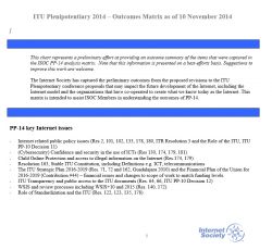 The Internet Society has captured the preliminary outcomes from the proposed revisions to the ITU Plenipotentiary conference proposals that may impact the future development of the Internet, including the Internet model and the organizations that have co-operated to create what we know today as the Internet. This matrix is intended to assist ISOC Members in understanding the outcomes of PP-14.