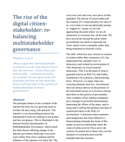 In this context the state is just one stakeholder in the mix of influencers and opinion formers impacting on our behaviours, and indeed our ideas of what is public. The question of what it means to create or own something, and how all these new relationships to be ordered and governed are subject to fundamental change. While government can often appear slow, unwieldy and even irrelevant in much of this context, there remains a need for some sort of political control to deal with the challenges that technology creates but cannot by itself control. In order for the internet to continue to evolve successfully both technically and socially it is critical that the multistakeholder nature of internet governance be understood and acknowledged, and perhaps to an extent, re- balanced. Stakeholders can no longer be classified in the broad headings of government, private sector and civil society, and their roles seen as some sort of benign and open co-production. Each user of the internet has a stake in its efficacy and each by their presence and participation is contributing to the experience, positive or negative of other users as well as to the commercial success or otherwise of various online service providers. However stakeholders have neither an equal role nor an equal share. The unequal relationship between the providers of content and those who simple package up and transmit that content – while harvesting the valuable data thus produced – needs to be addressed. Arguably this suggests a role for government that involves it moving beyond simply celebrating and facilitating the on- going technological revolution. This paper reviews the shifting landscape of stakeholders and their contribution to the efficacy of the internet. It will look to critically evaluate the primacy of the individual as the key stakeholder and their supposed developing empowerment within the ever growing sea of data. It also looks at the role of individuals in wider governance roles. Governments in a number of jurisdictions have sought to engage, consult or empower citizens through technology but in general these attempts have had little appeal. Citizens have been too busy engaging, consulting and empowering each other to pay much attention to what their governments are up to. George Orwell’s view of the future has not come to pass; in fact the internet has insured the opposite scenario has come to pass. There is no big brother but we are all looking over each other’s shoulder all the time, while at the same time a number of big corporations are capturing and selling all this collective endeavour back to us.