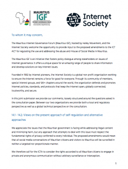 The Mauritius Internet Governance Forum (Mauritius IGF), hosted by Halley Movement, and the Internet Society welcome the opportunity to provide input to the proposed amendments to the ICT ACT for regulating the use and addressing the abuse and misuse of Social Media in Mauritius.